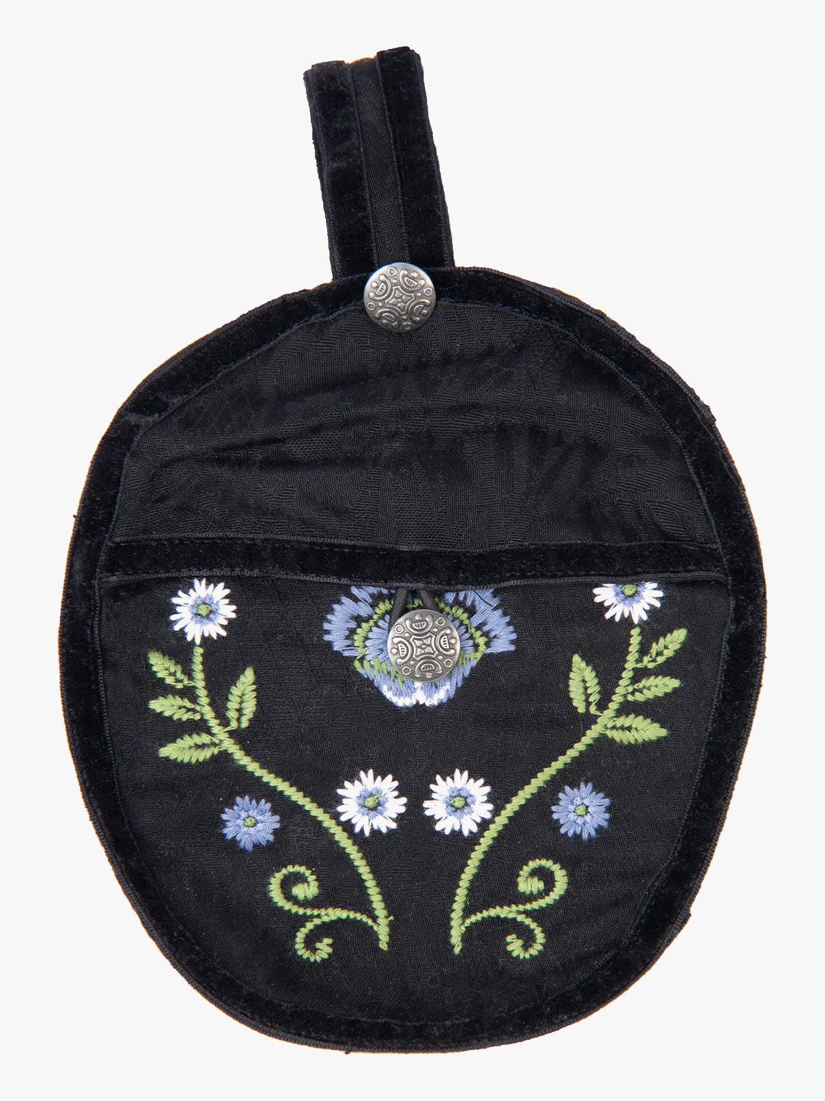Denne vesken er et dekorativt tilbehør som passer perfekt til festdrakt. Det vevde stoffet gir et klassisk uttrykk, mens fløyelskantene rammer inn designet på en fin måte. Det detaljerte blomsterbroderiet gir et tradisjonelt preg med fine nyanser. En liten veske som både er praktisk og løfter antrekket.