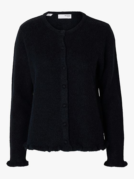 Denne cardiganen i en myk og lun ullblanding gir et tidløst uttrykk du kan bruke gjennom hele høst- og vintersesongen. Den har rund hals, lange ermer og ribbestrikkede mansjetter som holder passformen fin. De små stoffkledde knappene og den lett bølgede kanten gir plagget et subtilt, feminint preg. Et komfortabelt hverdagsplagg som er enkelt å style.
