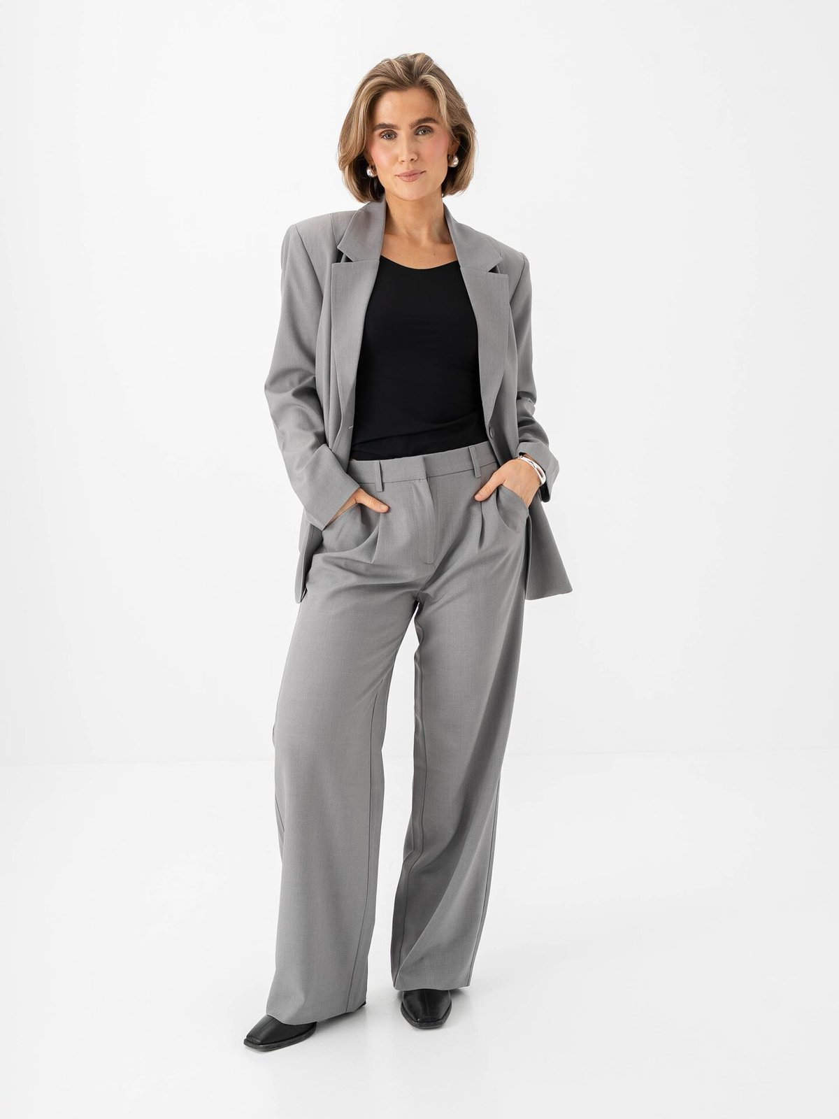 Et gjennomført antrekk som kombinerer rene linjer og komfort. Den grå blazeren og matchende buksen fra Ichi gir et tidløst uttrykk som enkelt kan styles både opp og ned.