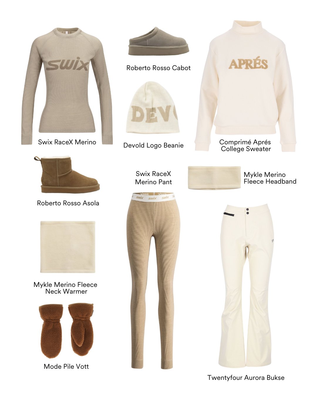 En drømmeliste fylt med lune base layers, trendy boots og cozy tilbehør i harmoniske beige- og kremtoner. Perfekt for deg som vil holde deg varm, komfortabel og stilsikker gjennom hele vinteren - enten du er ute i bakken eller nyter en avslappet après-stemning.